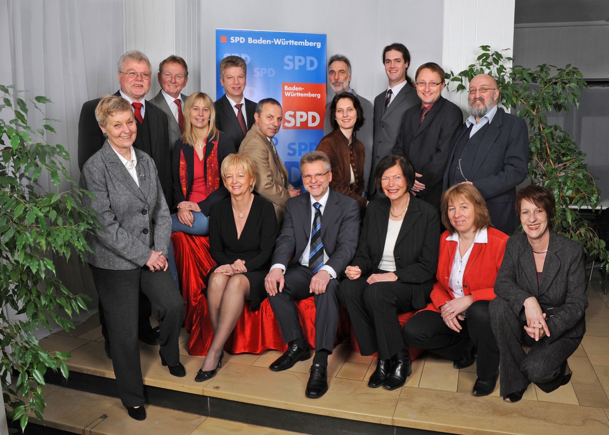 Auf dem Bild von links nach rechts: Brigitte Fink (Platz 14), Wolfgang Stehmer MdL (Platz 4), Claus Schmiedel MdL (Platz 6), Judith Raupp (Platz 5), OB Jürgen Kessing (Platz 1), Veronika Sonntag (Platz 10), Atilla Ihtiyar (Platz 9), OB Michael Makurath (Platz 3), Gerhard Jüttner (Platz 13), Andrea Schwarz (Platz 2), Oliver Hartstang (Platz 11), Ingeborg Löhmar (Platz 8), Klaus Bakalorz (Platz 15), Andrea Tröscher (Platz 16), Eberhard Berg (Platz 7), Regina Traub (Platz 12)